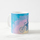 Aqui está uma caneca de café personalizada única e bonito que apresenta uma imagem de silhueta azul de uma garota andando de bicicleta. A imagem é colocada sobre um fundo abstrato colorido em tons de azul, ceruliano, lavanda e rosa. O fundo parece um nascer do sol abstrato. Seu monograma triplo ou outro texto está no topo em azul de ardósia correspondente. A imagem da menina de bicicleta está no centro, e o monograma de três letras é impresso em cada lado.