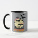 Uma caneca de café que diz "Pausa da Rotina" com uma imagem de Halloween de morcegos voando de uma cidade em frente a uma lua brilhante é um design divertido e assustador, frequentemente usado por aqueles que buscam uma pausa de sua rotina diária. Sugere um desejo de escapar dos estresses da vida cotidiana e abraçar um estilo de vida mais aventureiro ou emocionante.