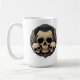 Representação artística traçada com um design com três crânios humanos. O crânio central é acentuado, cercado por padrões abstrato ornamentais num tema monocromático, criando um sentido de mistério e elegância gótica.