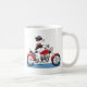 Um cachorro está dirigindo uma moto vermelha. Seus ouvidos, cachecol e cauda estão voando no vento e seu capacete tem decalques ósseos.