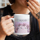 Miúda, bonitinha, vintage, caneca púrpura retro floral com gato kawaii, listras coloridas, flores e apelido personalizado.
