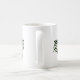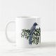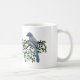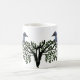 Pernais Azuis tocados em galhos da árvore. Os pássaros se enfrentam de lados opostos da caneca. Ramais e folhas são verdes escuros,