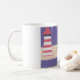 Esta clássica caneca branca é projetada com uma pintura em papel que retrata uma cena de praia com um farol vermelho e um oceano azul com veleiros