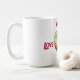 Uma caneca com uma ilustração de dois gatos apaixonados, dormindo em sua caixa acolchoada. Latas de comida de gato e leite nas proximidades. A ilustração é rodeada pelo texto: "Coma Repetição de Amor no Sono".