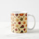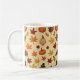 Esta é uma caneca com um padrão de Ação de Graças. O padrão inclui folhas de carapaça representando queda e peru, que é uma comida de Ação de Graças.