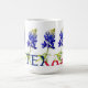 Design de caneca única com flores de Bluebonnet do Texas contra um fundo branco limpo, com o Texas impresso corajosamente na parte inferior. A flor de Bluebonnet é a flor do estado do Texas. Em março e abril, estas lindas flores florescem em campos e meios de comunicação nas autoestradas.