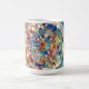 A imagem é um trabalho de arte de mosaico colorido que apresenta um padrão intrincado de formas e linhas giratórias. O design inclui uma variedade de cores, como azul, verde, amarelo, laranja e vermelho, criando um efeito visual dinâmico e vibrante. As peças do mosaico são dispostas de uma forma que forma um padrão fluente, quase floral, com elementos circulares e espirituais. A trabalho de arte é visualmente cativante devido à sua complexidade e à mistura harmoniosa de cores.