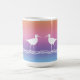 Aves aquáticas (furões). Imagem gráfica branca de duas aves diferentes em pé na água. O par é invertido para que as quatro aves fiquem no centro. O plano de fundo é constituído por cores laranja, cor-de-rosa, roxo e azul (de cima para baixo)