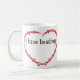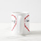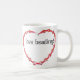 Colar com osso: miçangas de vidro vermelho com flores brancas. A fita de colar se forma em forma cardíaca. Imagem em cada lado da caneca. Texto no centro dos corações lê "Eu adoro o beading"