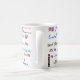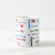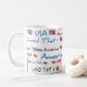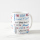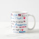 Uma caneca branca com a América Deus abençoe e outras palavras e símbolos patrióticos.