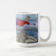 Mug with watercolor collage of Joanna flying over animals. Dark blue painted back ground