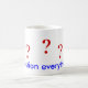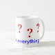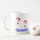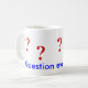 Pontos de interrogação em vermelho. 5 são espaçados ao redor da caneca. Abaixo está o texto em azul "Pergunta tudo"
