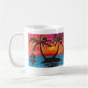 Cena tropical com sol por trás de uma pequena ilha com duas palmeiras. Céu vermelho e amarelo sobre a água azul. Dois barcos de vela em ambos os lados da ilha. A imagem é duplicada no verso.