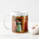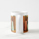 Colheres e cones de fios enrolados em torno da caneca. "Fios.......... Fios.......... Fios.......... Fios.........." mostra acima. Cores de fios: laranjas, rosa, rosa, aqua, dourados, castanhos.