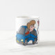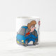 Uma mulher em um acidente de carro agora parada ao lado do carro. Esta design parece realmente eficaz nesta Mug