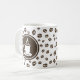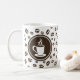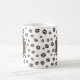 © Sunny Mars Designs. Taça Alta de Vapor de Café com Mug de Café - Caneca de café Trendy com uma linda caneca de café alto e discos com vapor saindo dela e ilustração do vetor de fundo do padrão de grãos de café.