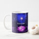 Namaste - adicione um senso de paz e apreço com a citação de Namaste nesta caneca de café. Estrelo atordoante brilha numa Flor de Lotus de Cristal roxo. O namaste pode ser substituído por qualquer personalização desejada.