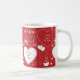 Uma caneca projetada com dois nomes de padrão de namorados, branca em vermelho. Personalize a caneca com seus nomes de coração, cor de fundo, entre outras opções.
