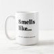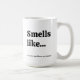 Uma xícara de café personalizada mostra o ditado: "Cheira como...não é mais meu problema." na frente e atrás e seu nome no lado. Excelente para você ou dar como presente.