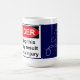 Perigo! Tocar nesta caneca pode conduzir a ferimento sério. Caneca engraçada com um sinal de aviso em um lado, e o esboço de um corpo que encontra-se no giz que toca no esboço de uma caneca no giz no outro. O fundo é um inclinação de azul escuro a enegrecer. Grande presente do escritório!