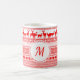 Padrão tradicional e bonito da Lapónia para presentes de natal, ocasião e muito mais. Rein veers e cristais de neve em vermelho em caneca personalizável com etiqueta branca para monograma ou nome.