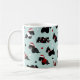 Cães escoceses bonitos vestidos com roupas festivas de férias, chapéus de Papai Noel e blusas de argila com Enfeites de natal dispersos em fundo azul.