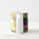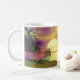 Xícara de café com minha trabalho de arte de uma cena tropical ensolarada e relaxante de uma ilha, palmeiras e veleiros passando por um grande pôr do sol.