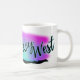 Céus de praia neon em Key West com a praia e a silhueta das palmeiras contra um pôr do sol colorido.