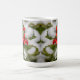 Folhas sagradas verdes profundas com bagas vermelhas brilhantes contrastam com neve fresca e caída.