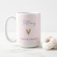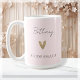 Procurando o presente perfeito para as damas de honra para mostrar sua gratidão às suas melhores amigas? Não procure mais do que nossas modernas canecas de café com coração de ouro! Com uma fonte elegante que escreve "Dama de honra" e o nome da sua amiga em letra moderna sobre um fundo rosa bege, esta caneca de café é a maneira ideal de agradecer às suas damas de honra por estarem ao seu lado no seu dia especial. Quer esteja planejando uma despedida de solteira ou simplesmente queira dar um presente atencioso e personalizado, nossas canecas de café são a escolha perfeita.