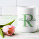 Tendy classic mug com um grande nome inicial monograma e script em ambos os lados em verde. Alterar nome e iniciais usando o Modelo fornecido. Consulte "Sobre este produto" ao lado para obter informações adicionais.