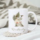 Uma caneca de café personalizada com uma letra boêmica "K" monograma, com ilustrações decorativas de orquídea e folha de palma. Personalize-o facilmente com o seu nome ou crie um presente único para os seus entes queridos.
