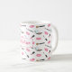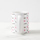 Esta caneca apresenta o padrão ilustrado de Destei de vários tipos de produtos de maquiagem junto com lábios cor-de-rosa. Esses produtos de maquiagem incluem batom, rímel, pó com espelho e escovas de maquilhagem. Há também uma área de texto personalizável para um nome em cor rosa.