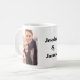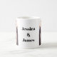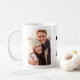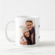 Uma caneca de café com foto da família com nomes. Substitua a foto por sua e altere o texto.