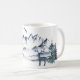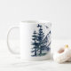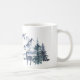 Esta caneca de café apresenta um estilo aquarela na cena do Pacífico Noroeste. Uma imagem das montanhas rochosas cobertas de neve é fotografada a distância. Um veado macho é fotografado perto da frente, entre uma floresta de pinheiros. Um bando de pássaros voa sobre as árvores.