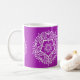 Esta mandala branca senta-se sobre um fundo roxo brilhante. A cor é brilhante e criativa. Parte da coleção Jarn Mandala. Este design pode não ser impressão tão brilhante quanto aparece on-line.