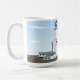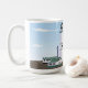 Este desenho apresenta um farol branco, verde e preto sobre o mar. O céu é azul com algumas nuvens. Casas brancas com telhados verdes cercando o farol.