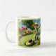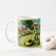 Um homem de desenho animado está cortando a lei de um jardim vibrante cheio de flores e árvores coloridas. A cena é colocada contra um céu azul brilhante com nuvens brancas lisas. Este é um presente perfeito para a pessoa que faz o seu jardim.