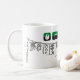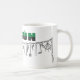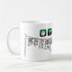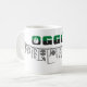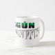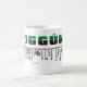 Oggun mug com achaba. Nome de Oggun no texto com design de cowrie. Impresso em três cores; verde, preto e cinza.