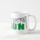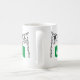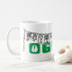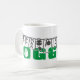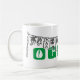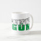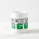 Oggun mug com achaba. Nome de Oggun no texto com design de cowrie. Cores verdes e cinzas impressas.
