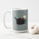 Um gato preto giro com um café e um coração