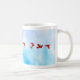 caneca com fundo de aquarela azul e aves de origami vermelhas. A forma da caneca é cilíndrica, com um punho branco e um interior branco. O fundo é uma lavagem de aquarela azul-clara. Há seis aves de origami vermelhas espalhadas pelo fundo. A caneca está em uma superfície de mármore branco.
