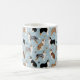 Pastores australianos lindos / Cães australianos em casacos pretos, marrons e de funil sentam-se e mantêm ossos de cães espalhados e estampas de pata em um fundo azul claro.