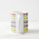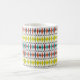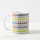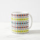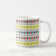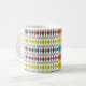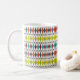 Esta caneca tem um design moderno do século médio de diamantes esticados e estereótipos em um campo de branco.