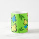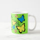 Design de borboleta amarela e azul com folhas estilizadas decorativas sobre fundo verde-claro