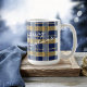 Se você está se perguntando que combinações de cores escolher para sua decoração de Natal e presentes este ano, eu criei coleções de padrões coordenadores para tornar a vida um pouco mais fácil. Esta caneca de café apresenta uma design xadrez moderna, aconchegante, mostrada aqui em uma paleta de cores azuis e douradas. Adicione uma mensagem e um nome usando o modelo fornecido. Procure ID1009 para ver outros produtos e padrões neste esquema de cores.
