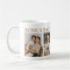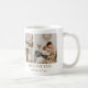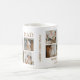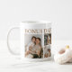 Uma caneca de café feliz de Natal com 6 fotos e texto que diz "BONUS PAI, MERRY CHRISTMAS, NÓS TE AMAMOS" e é personalizada com os nomes das crianças. A caneca é facilmente personalizada e os estilos de fonte, tamanho e cores podem ser alterados clicando no link personalizar depois de personalizar.