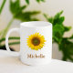 Caneca de café russa com uma imagem de floração de girassol amarelo. Com a inscrição personalizável marrom, você pode personalizar com suas próprias informações. Excelente para apreciar sua bebida quente favorita.