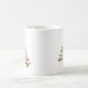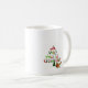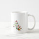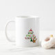 Uma árvore de Natal vermelha, branca e verde, muito feliz com um pássaro num chapéu de Papai Noel olhando.