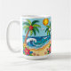 A coastal Coffee Mug in a paper quilling style ai illustration of two palm trees, the sun, ocean waves, a beach and tropical flowers.
